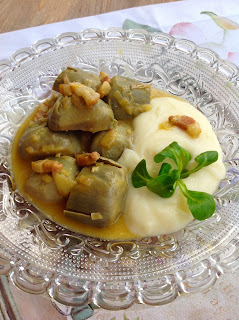 Servimos las alcachofas en un plato acompañadas del pure y a disfrutar !!