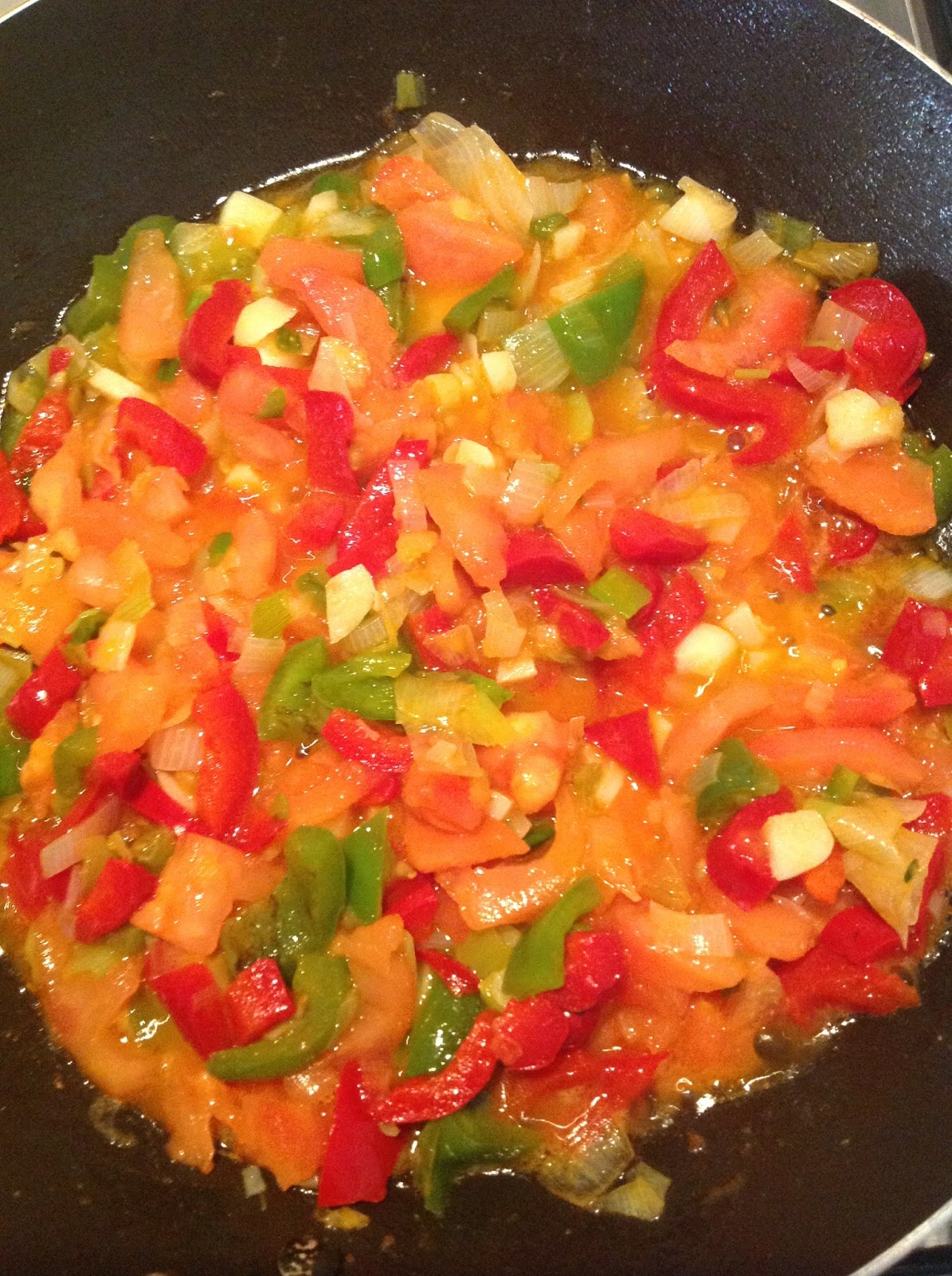 – 2 Ponemos una sartén al fuego y vertemos un generoso chorro de aceite de oliva, cuando caliente incorporamos las cebolletas picadas , los pimientos y vamos sofriendo a fuego medio. A continuación agregamos los ajos picados y por último los tomates pelados y troceados muy finos . Seguimos sofriendo.