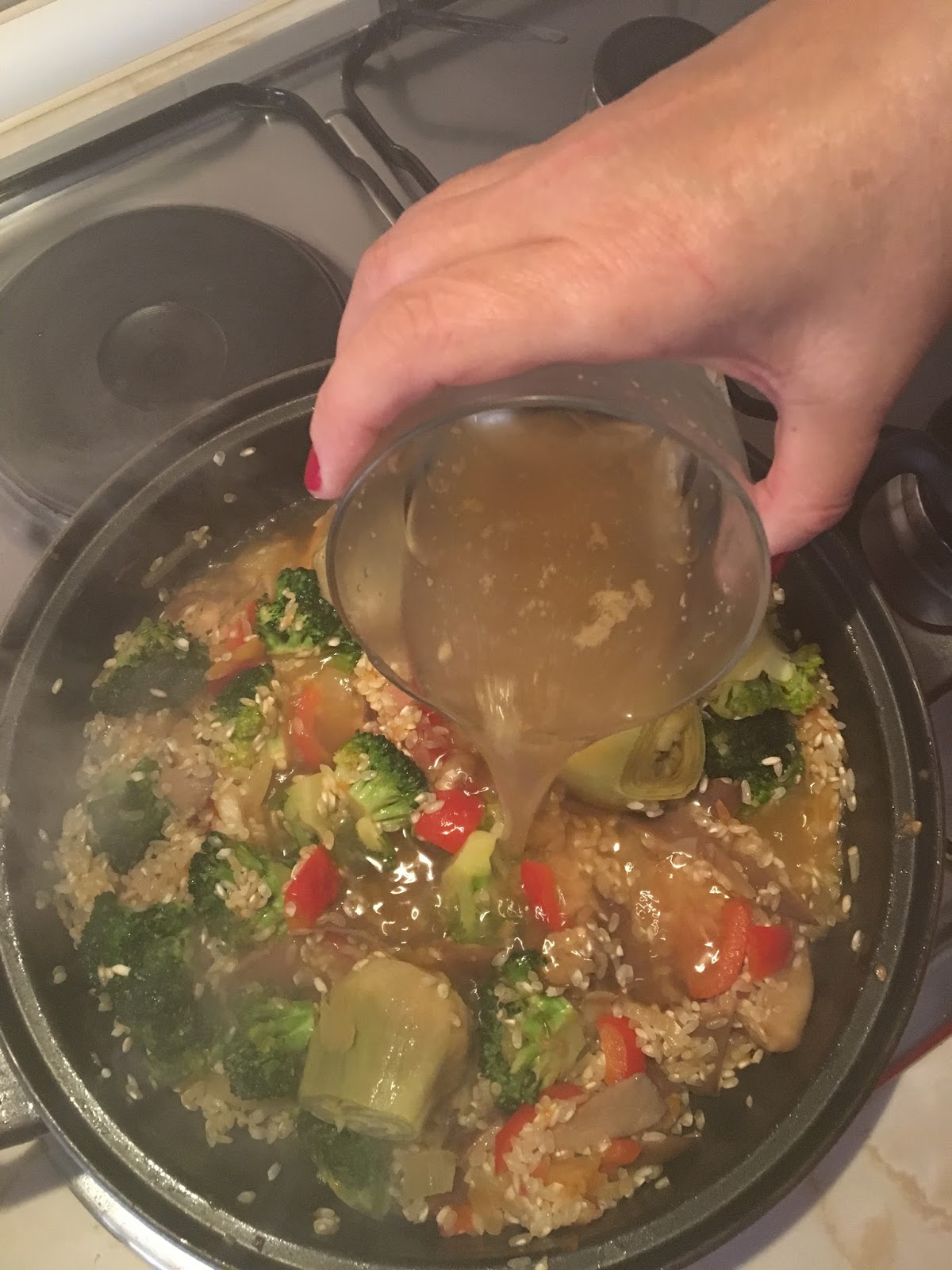 – 3 Añadimos ahora el arroz y le damos unas vueltas para rehogarlo , echamos el caldo de pollo ( el doble de caldo que de arroz ) mas una taza mas que yo le pongo siempre , ponemos la sal y dejamos cocer unos 15-20minutos .