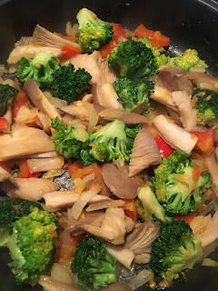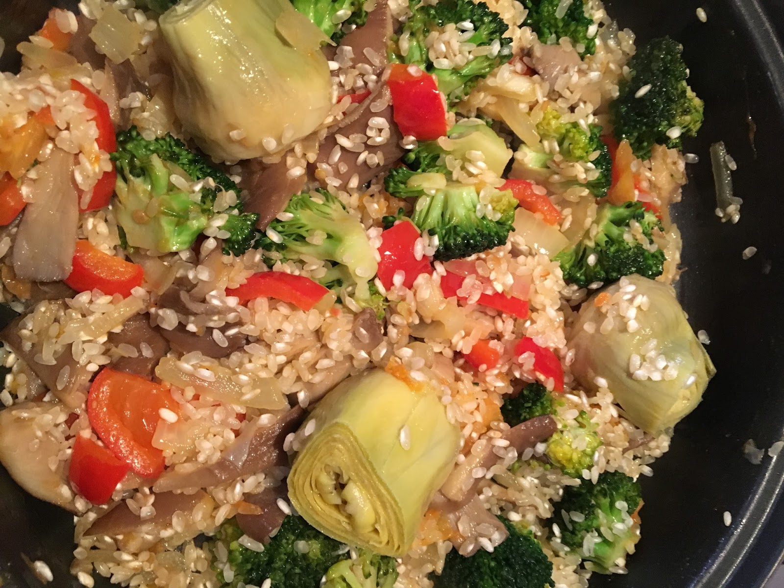 – 2 A continuación añadimos , el brócoli en racimitos pequeños y seguimos rehogando , incorporamos las setas troceadas y las alcachofas ( yo las he puesto de bote , pero se pueden poner también frescas ) , seguimos sofriendo, unos minutos mas .