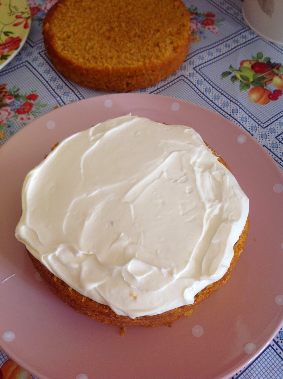 9. Sacamos el frosting de la nevera y ponemos una buena cantidad sobre uno de los bizcochos , igualamos y repartimos bien y colocamos encima el otro bizcocho .
