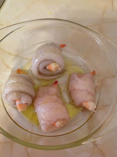 – 2 Precalentamos el horno y como ya nuestro amigo el pescadero nos ha preparado los filetes de gallo , los salpimentamos y ponemos dos langostinos , ya pelados , en cada filete . Enrollamos el filete , con la piel hacia dentro y desde el extremo más ancho, sujetando bien los langostinos , obteniendo así las cuarto espirales .