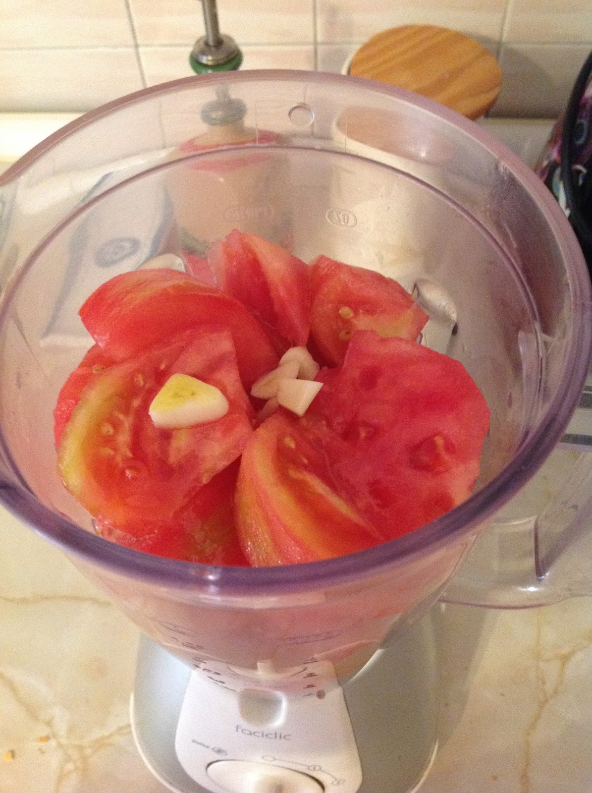 – 1 En primer lugar preparamos el salmorejo , poniendo en la batidora : el pan , el trocito de ajo , los tomates pelados y troceados , sal y un buen chorro de aceite de oliva, lo dejamos remojar unos 10 minutos , que se ablande el pan y luego lo trituramos muy fino. Reservamos.