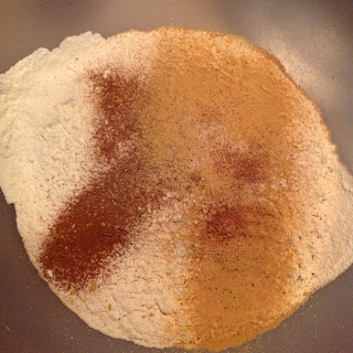 – 1 Lo primero , precalentamos el horno a 180 g y en un bol grande , vamos poniendo los ingredientes secos , la harina , la canela , el jengibre , el bicarbonato , la nuez moscada ,la levadura , mezclamos bien y tamizamos todo junto , poniendolo en otro bol , reservamos .