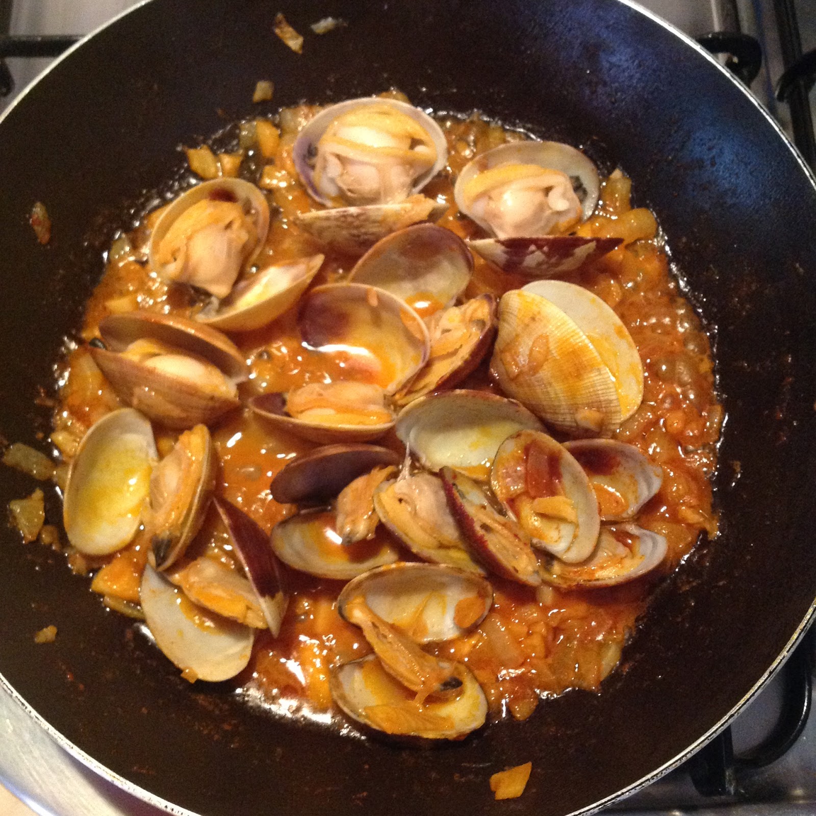 – 4 Una vez blanda la cebolla incorporamos las almejas , removemos bien todo y tapamos para que se abran las almejas , cuando abran retiramos del fuego la sartén y añadimos la cucharada de pimentón , removiendo bien . Ponemos todo con los judiones y añadimos también el bacalao , salamos al gusto y dejamos cocer para que mezclen bien todos los sabores , lo dejamos una media hora más , según estén de cocidas las almejas .