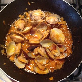 – 3 Lavamos muy bien las almejas con sal y abundante agua y reservamos. A continuación ponemos una sartén al fuego con un buen chorro de aceite de oliva , pelamos y cortamos la cebolla y los ajos y añadimos a la sartén pochando lentamente .