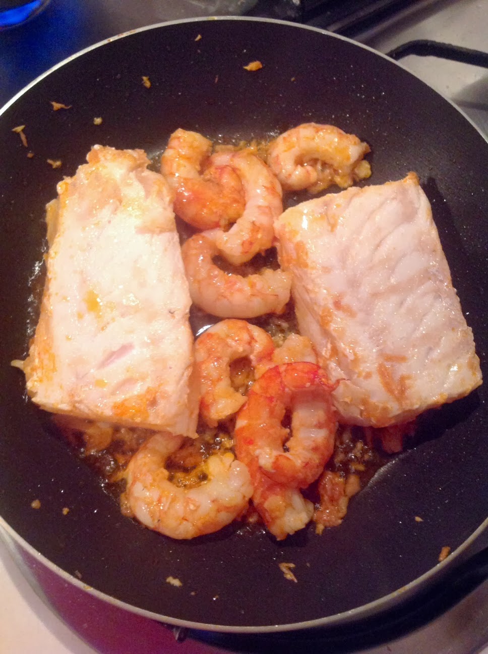2. En una sartén o cacerola plana ponemos un chorrito de aceite de oliva y agregamos los gambones pelados. A continuación majamos los ajos y añadimos a la sartén, revolvemos bien y lo dejamos un par de minutos a fuego lento. Añadimos una pizca de harina y removemos bien.