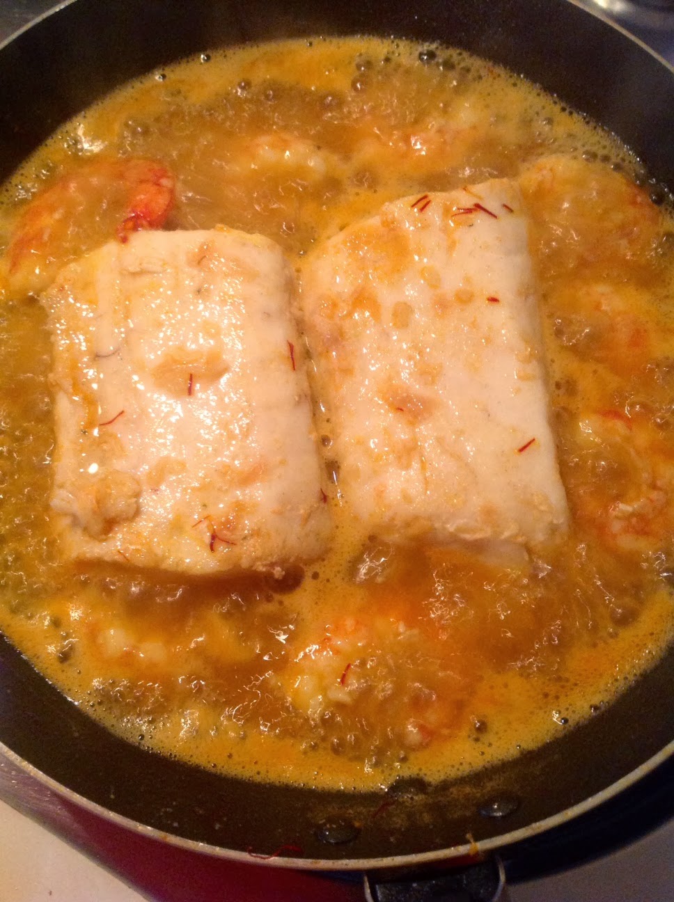 4. En este momento agregamos el caldo de cabezas que ya tenemos colado y dejamos que vaya reduciendo, añadimos seguidamente el azafrán y el medio vasito de nata. Cuando veamos que empieza a espesar retiramos del fuego y servimos. El proceso de cocción del pescado es de unos 10 minutos sino se pasa y queda más seco.