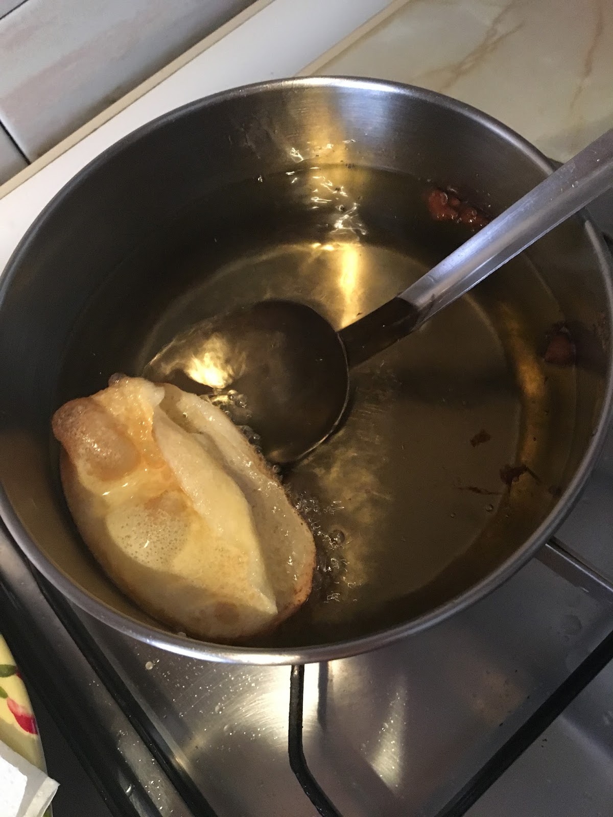 – 2 Ponemos un cazo al fuego con abundante aceite de girasol y metemos en ella cuchara con la que vamos a hacer las orejas , para que se caliente . Una vez caliente el aceite , sumergimos la cuchara en la masa , pero sin cubrirla del todo de masa , para que se suelte bien en el aceite.
