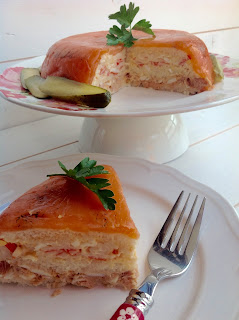 Es una receta muy sencilla y muy vistosa . Hay que hacerla de un día para otro, para que siente bien y no se deshaga al partirla . Tiene que estar dentro del frigorífico hasta la hora de servir .El molde a utilizar puede ser de cualquier forma , yo he usado uno para unas cuatro personas . Si van a ser más comensales ya sabéis , se aumenta el tamaño del molde y las cantidades. Pues nada vamos a ello que está delicioso !!