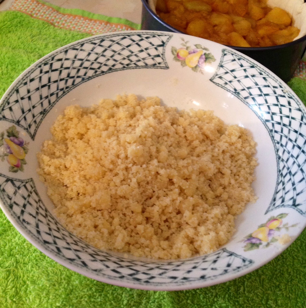 3. Preparamos el crumble con la harina, el azúcar, la mantequilla reblandecida y la almendra molida; mezclamos bien con las manos, quedará todo suelto y apelmazado. Es el momento de ponerlo todo sobre las manzanas cocidas y distribuirlo por toda la tarta.