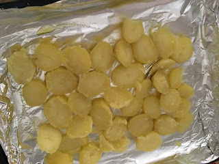 – 1 Pelo y troceo las patatas el laminas gruesas, las dejo cocer unos minutos , pero sin que se cuezan del todo . Voy precalentando el horno a unos 180g .