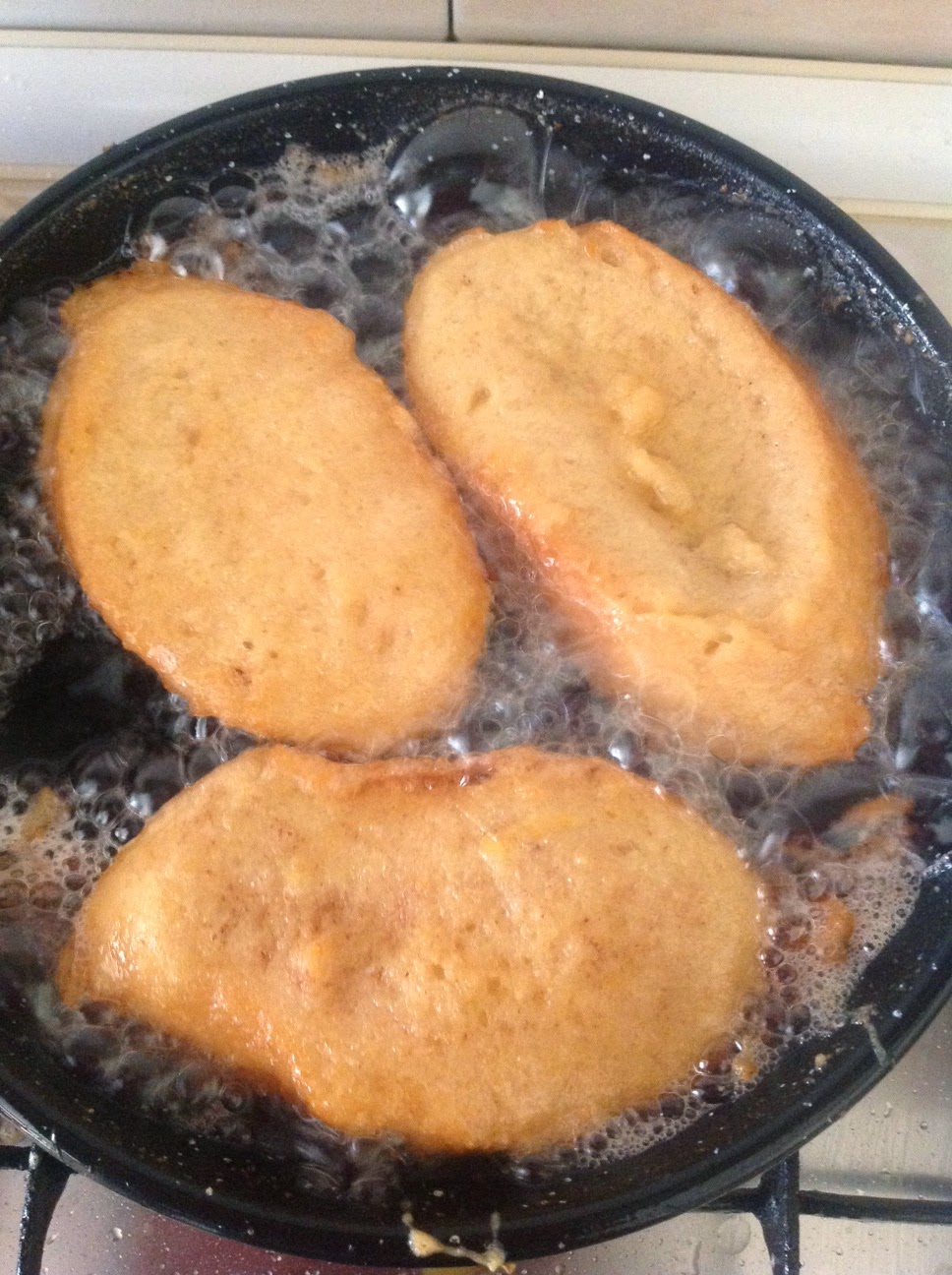 6. Batimos los huevos en un bol y rebozamos el pan en los huevos friendo a continuación en el aceite caliente, no ponemos el fuego muy fuerte para que no se nos queme y no se queden feas.
