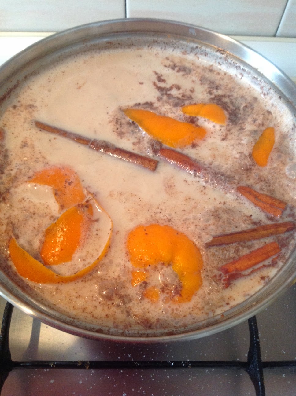 1. En una cacerola vertemos el 1,5l de leche, las peladuras de las naranjas, las ramas de canela, la canela en polvo y el azúcar. Llevamos a ebullición y dejamos cocer unos minutos. Removemos bien y dejamos reposar.